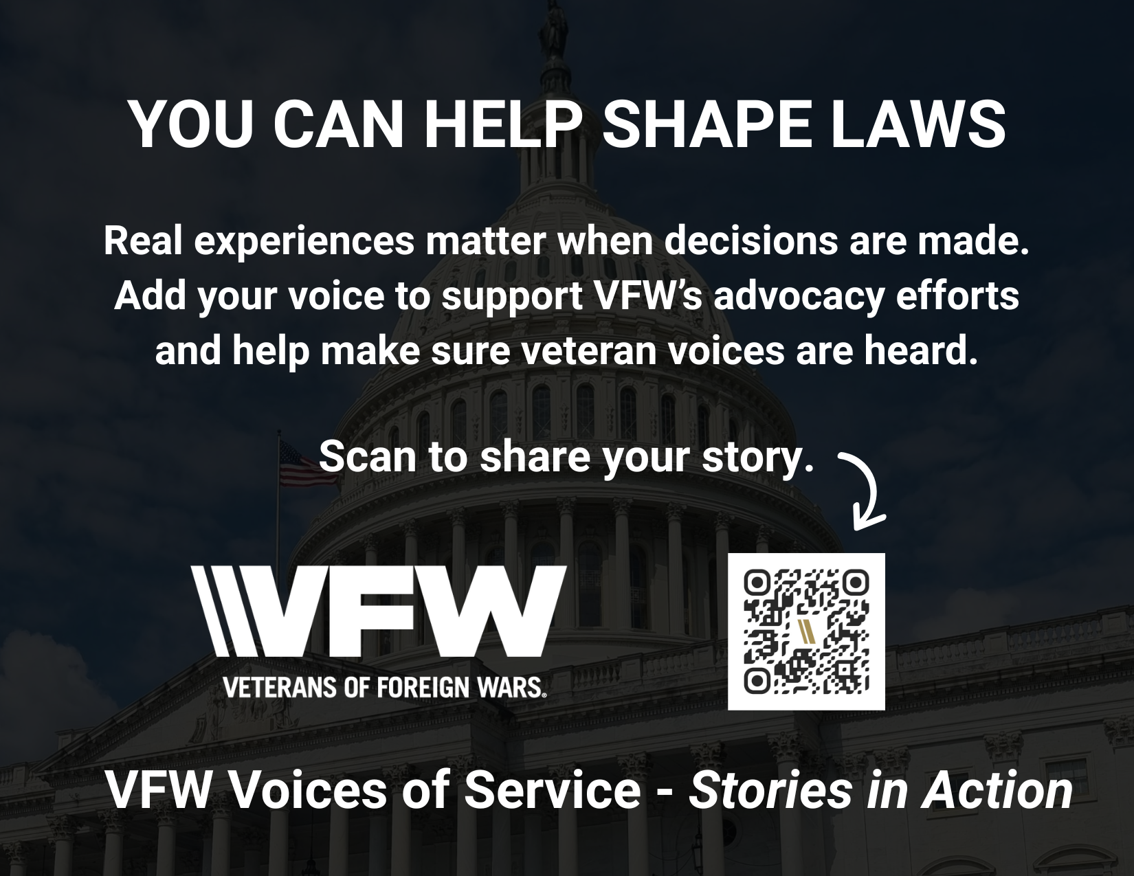 When the VFW advocates on Capitol Hill, real stories help lawmakers understand how veterans’ policies affect real people. Through VFW Voices of Service – Stories in Action, the VFW is collecting experiences from veterans, service members, and families through an official story bank. These stories, submitted directly through a secure form, will help educate Congress and the public and strengthen legislative advocacy.